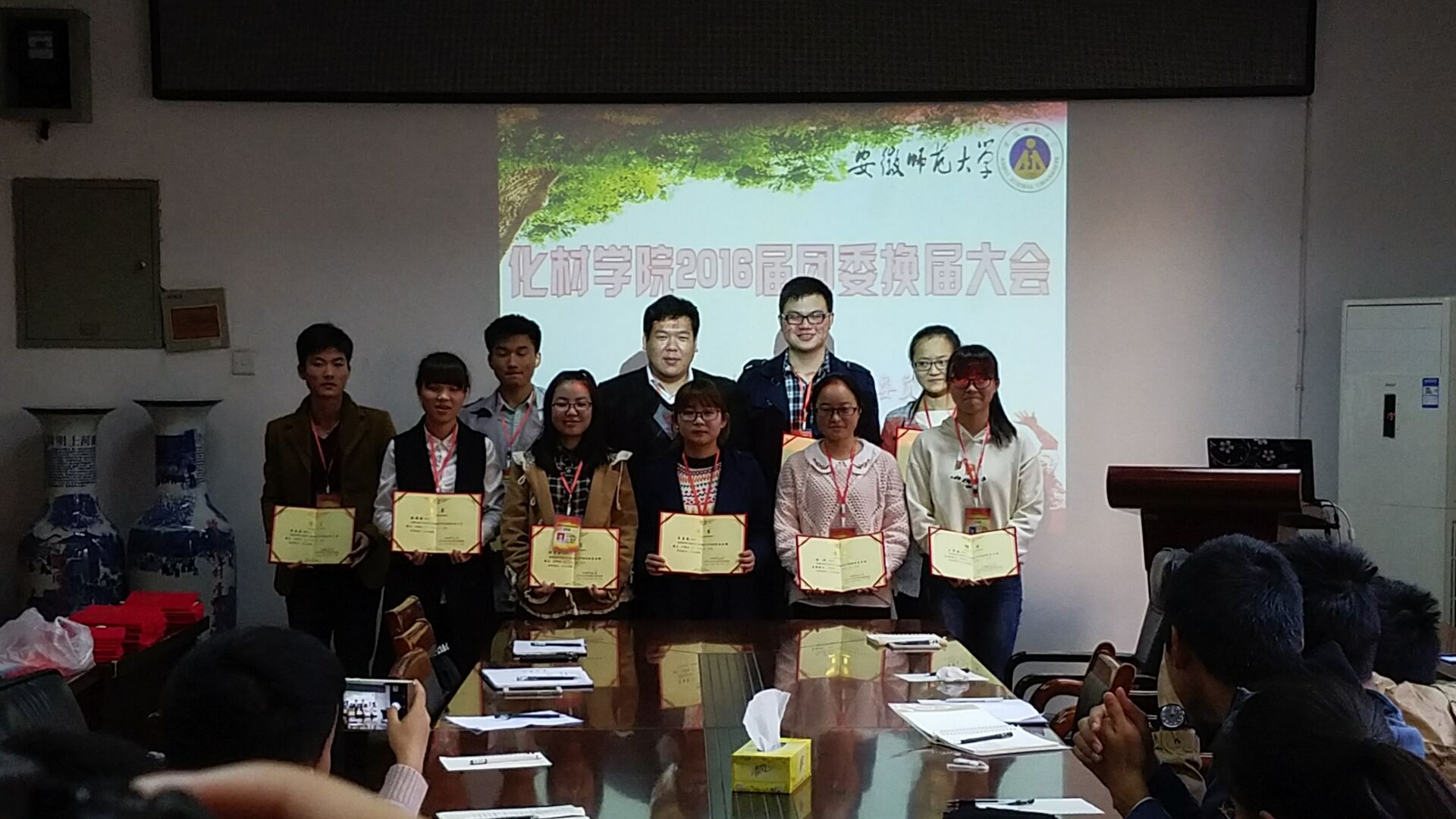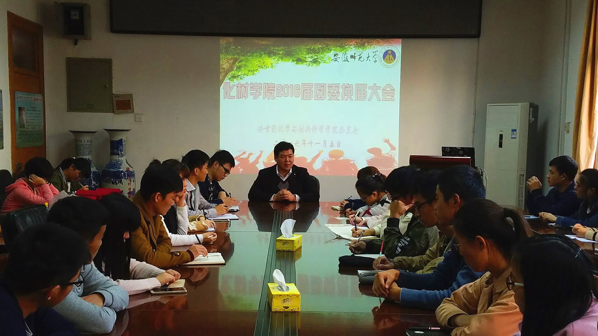 团委换届大会暨业务培训会在赭山校区生化楼会议室举行。学院团委蒋建伟老师受邀出席,团委全体成员参加了本次会议。