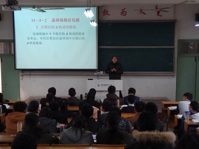 王正华教授讲授的是《配位化学晶体场理论》的内容,在授课过程中,王老师注重将知识回顾与新课讲授相结合,讲解由浅入深,时刻循循善诱。由于配位化学晶体场理论是无机化学中的难点内容,王老师一步一步地带领同学们推理正四面体、正八面体的晶体场稳定化能的公式,使同学们知其然也知其所以然,并结合典型例题,为同学们巩固知识。同时,王老师利用课堂提问有效地为同学们点出重点,使同学们能够深刻理解课堂知识、把握课堂教学内容。