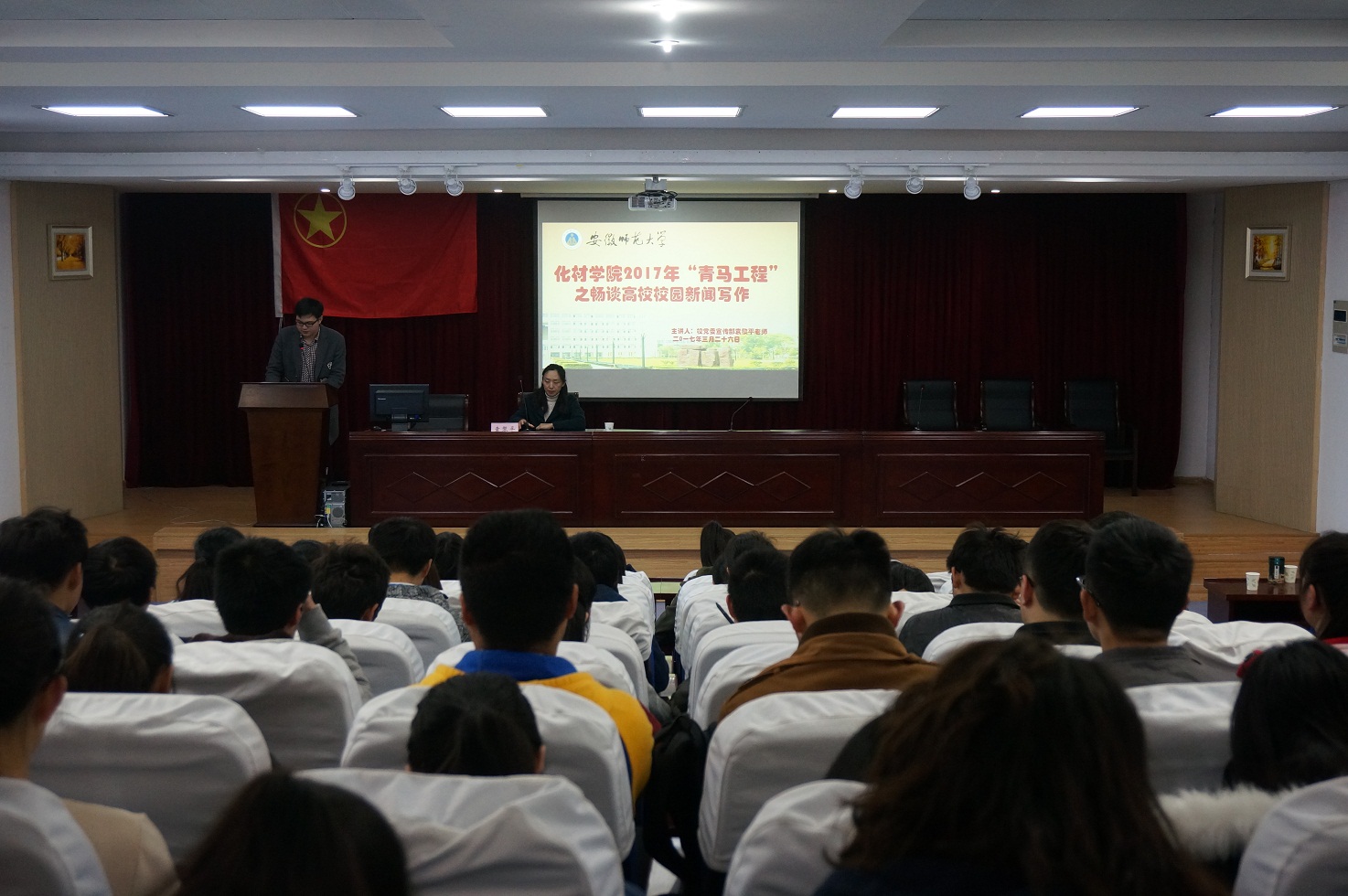 于3月26日上午9:00在图书馆报告厅举行了“畅谈高校校园新闻写作”专题讲座。校党委宣传部色情视频袁黎平老师出席此次活动并担任主讲人。培训会由培训班班长、院团委学生副书记汪洋主持召开。