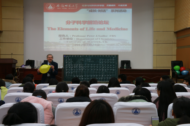 王国良)2017年3月24日,英国皇家科学院院士、华威大学化学院首席教授Peter J. Sadler应邀为化材学子做了一次关于分子科学前沿的讲座。讲座由国教院副院长杜俊主持。