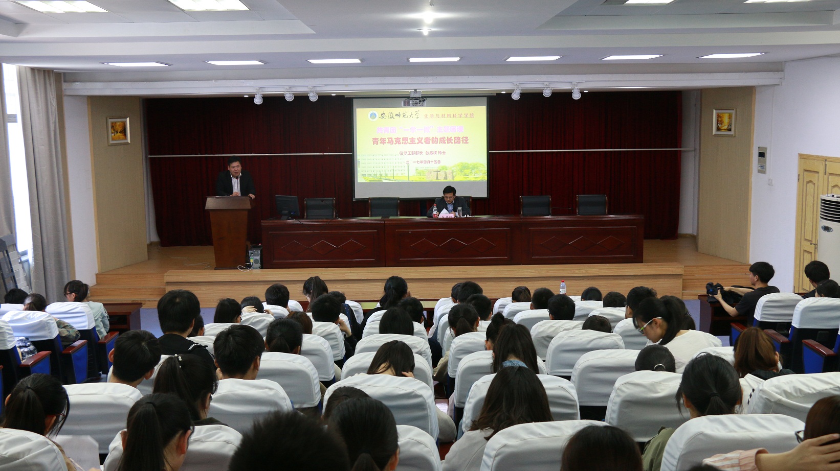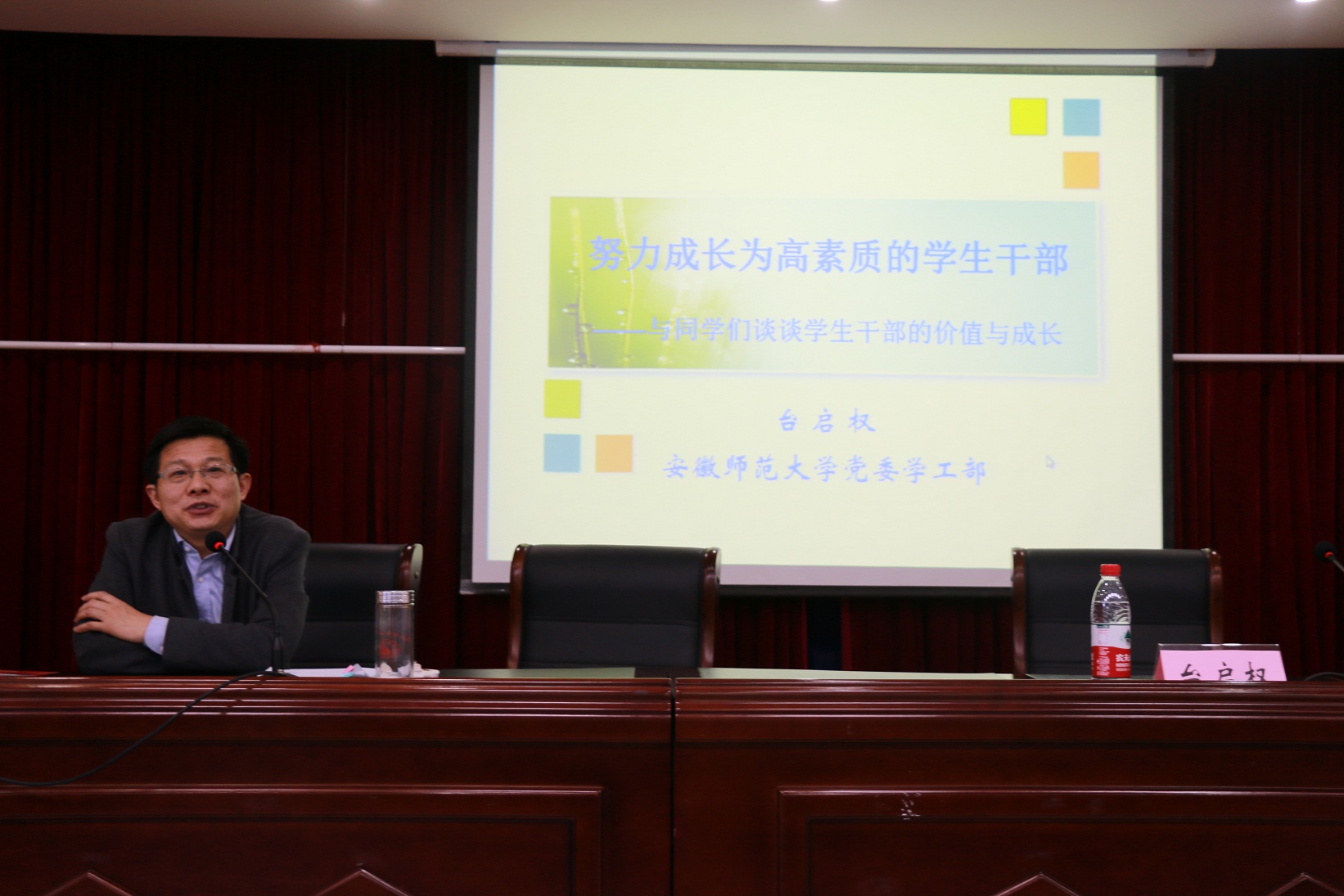 本网讯(“青马工程”培训班宣传员 李娜)4月15日上午,学校学生处处长台启权老师受邀于赭山校区图书馆报告厅为大家带来一场主题为“努力成长为高素质的学生干部”的讲座。本次讲座由团学骨干培训班班主任蒋建伟老师主持,近120名培训班成员聆听了讲座。