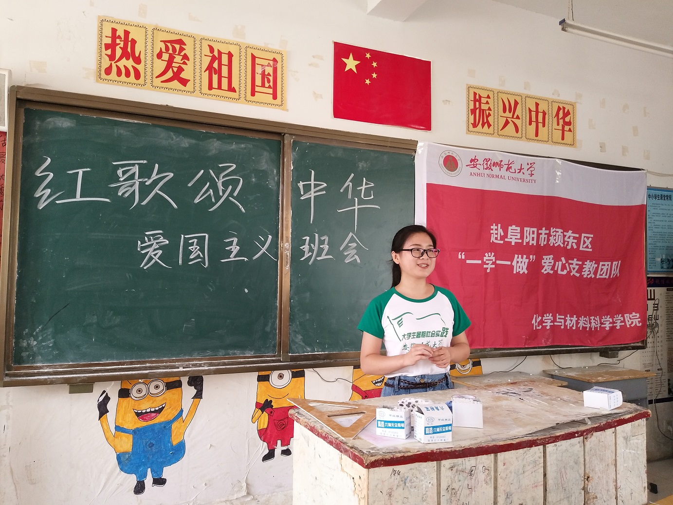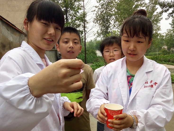 作为师范大学的师范生,化材学子也有一个教师梦。今年夏天,120余名化材学子自发组建了7支爱心支教实践团队奔赴江淮大地的贫困地区,用爱心课堂传播知识,用支教行动点亮希望的火把。在阜阳颖动区新乌江镇中心校,32名志愿者持续支教一个月,与孩子们一起学习、一起运动、一起成长、一起快乐……,在蚌埠怀远五郢村,14名大学生志愿者以“红色教育”、“环保教育”、“科学教育”和“传统文化教育”为留守儿童带去特殊的关爱……,在安庆岳西雷坳小学的支教课堂上,20余名志愿者与大山深处的52名留守儿童共同演唱“相亲相爱的一家人……”。就是这样的一群可爱的志愿者,他们自己联系实践地点,自己制定实践方案,自己用心把火把点燃,自己感悟实践心得,他们也自己品味到来自孩子和家长们高高竖起的“大拇指”。正如2015级化学师范专业高月同学所说“支教的生活像一杯清茶,舌尖轻触的微涩后确是无穷的回味……”