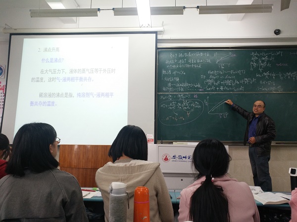 上课伊始,刘老师首先与同学们一道简要回顾了上节课的主要内容,在此基础上自然地引入了本节课的新内容“稀溶液的依数性”。通过图片的形式,结合生活中的应用,形象生动地介绍了三种典型的依数性,即凝固点降低、沸点升高、渗透压。凝固点降低的公式推导涉及到高等数学中的偏微商知识和积分知识,是这一章的重难点。在授课过程中,刘老师采用启发式教学,在黑板上边讲边写,从凝固点的定义出发,详细推导出凝固点降低公式。采用不同颜色粉笔标出重点,将凝固点降低公式的理论知识与冬天马路上除冰化雪有机联系起来,巧妙的融入到课堂的讲解之中。在详细讲解凝固点降低公式的基础上,用类推的方法讲述了沸点升高。
