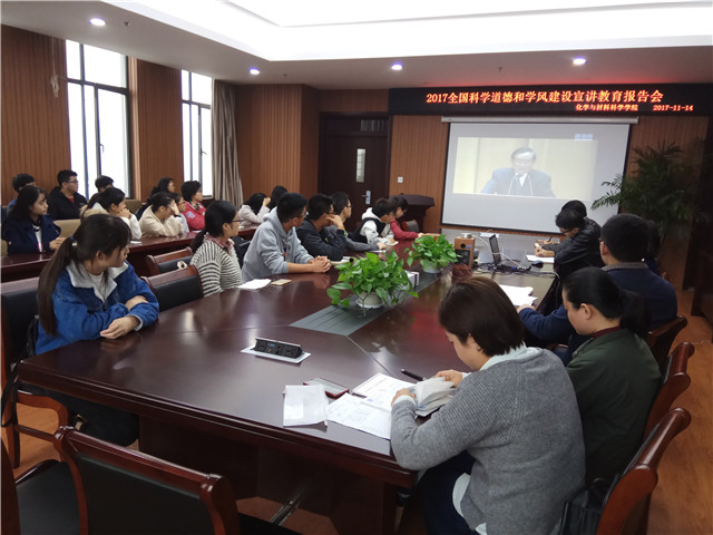 在院会议室组织师生共同收看2017年全国科学道德和学风建设宣讲教育报告会。学院副院长周双六,应用化学系主任盛恩宏,青年教师,博士、硕士研究生,本科生代表共五十人集中收看了直播会。