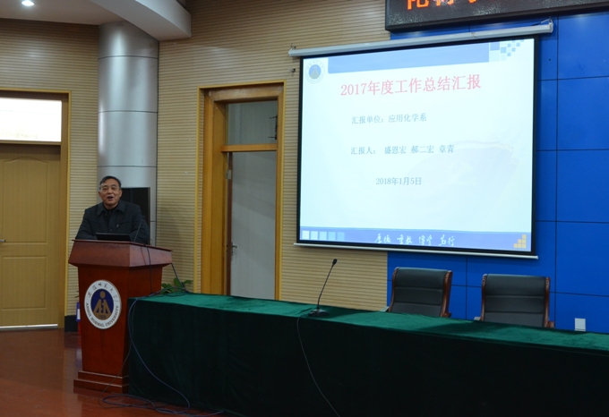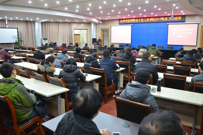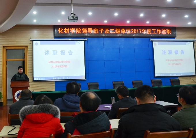 会议第二阶段,学院7个二级单位化学系、材料化学系、应用化学系、化学工程与工艺系、化学实验中心、综合保障服务部及皖江学院化学工程系主要负责人以PPT的形式对2017年的工作作了全面地汇报和展示。在汇报中各单位立足本职,通过一张张图片以及各类数据,交流经验,谋划发展。述职汇报结束后,由学院领导班子、教授委员会主任及各系主任、教师代表组成的评议小组以无记名打分的方式,对各二级单位的述职汇报进行了民主测评。