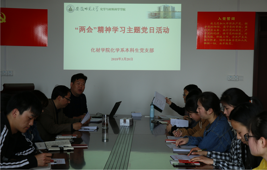 化学系本科生党支部开展“两会”精神学习主题党日活动,化学系全体党员出席了会议。学院党委书记汪俊武受邀参加活动,并给全体党员上了一节“两会”精神学习专题党课。活动由化学系本科生党支部书记蒋建伟老师主持。