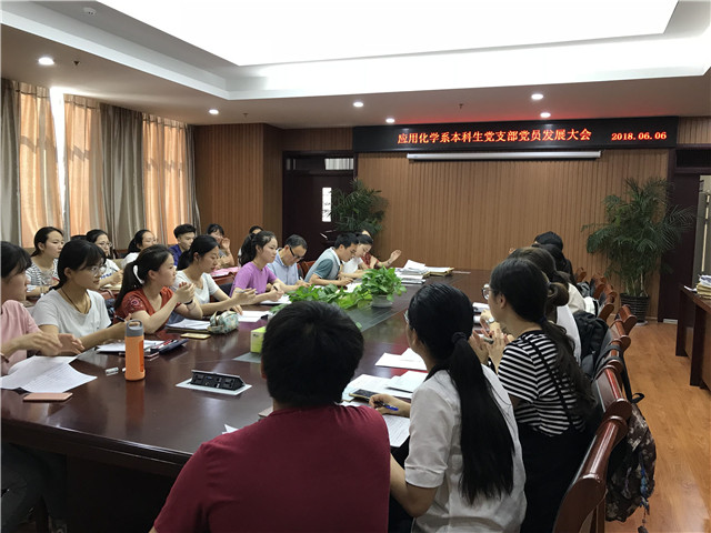 党委秘书汪丰云老师、入党介绍人朱姗老师、支部在校党员、本次发展对象参加会议。大会由应化系本科生党支部书记袁青兵老师主持。