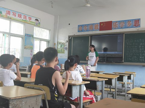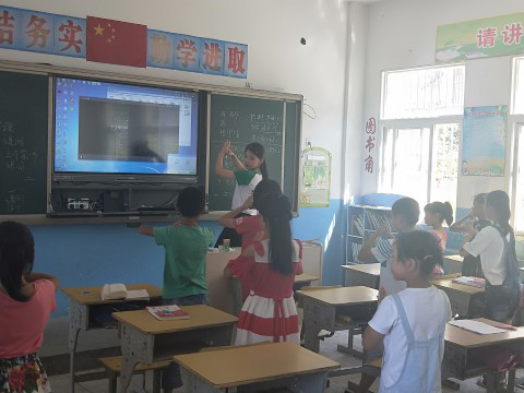 赴安庆北中实践团队于安庆市太湖县北中镇北中小学正式开始“七彩课堂”教学活动。17日下午共开设了两个班,每个班两节课。分别是作业辅导与手语舞《我和你一样》。首先是一个队员带的作业辅导,他在课堂上将上下课的作息时间讲了一下,着重强调了安全方面的问题。安全无小事,该名队员的做法显然是十分正确的。然后该同学让孩子们自己做作业,有问题或者疑惑随时提问,他也是立刻过去进行答疑解惑。课堂上安安静静,氛围良好。另一位同学进行的是手语舞《我和你一样》的教学。首先是播放了一遍该手语舞的视频,将孩子们的注意力吸引了过来。效果十分显著,孩子们都对这个新奇的东西表现出了浓厚的兴趣。之后队员便将动作分解,逐一地教给孩子们。课堂上放眼望去,孩子们挥舞着稚嫩的手臂,充满了欢乐的气息。那认真学习的模样俨然已经忘掉了天气的炎热。其实手语本来只是用于聋哑人的交流,但是很多人其实是歧视聋哑人这样的残疾人的,不过正如这个手语舞的名字:我和你一样。其实大家没有本质上的区别,更不应该有所谓的歧视。而这个手语舞教学正是让小孩子们从小便知道大家都一样,不去歧视聋哑人乃至残疾人,对孩子们价值观的影响可谓意义深远。