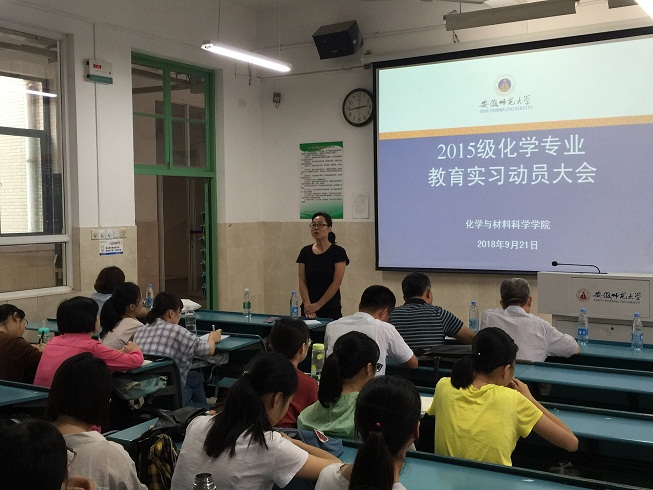 在教学楼2010201教室举行了教育实习动员大会。出席本次大会的有学院教学副院长张小俊、化学系副主任孙影、教育实习指导教师以及2015级化学系全体师范生。会议由化学系主任阚显文主持。