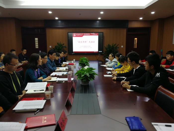 院长高峰,副院长张小俊,党委副书记余妍霞,化学系系主任阚显文,学院精心选聘的五位成长导师崔鹏、张继坦、倪祁建、毛俊杰、周能能以及2018级英才班全体同学参加会议。会议由余妍霞主持。