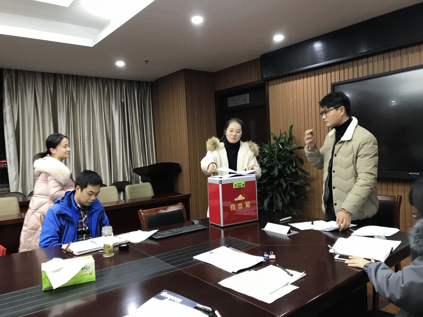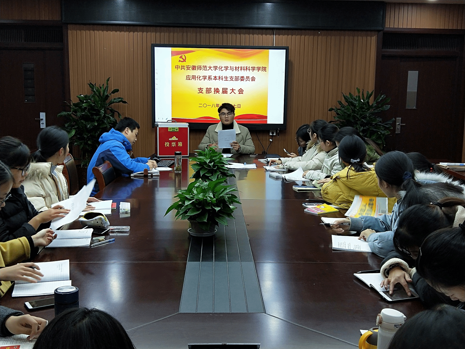 随后,蔡鑫同志在大会宣读了换届大会选举办法,大会由陈浩文同志为监票人,刘静同志为计票人,陶勇同志宣读了本次换届选举的候选人名单。投票和统计工作随之开始,依据本次选举办法和计票结果,陶勇、蔡鑫、王威峰、车亚敏以及李佳佳5位同志获得赞成票超过实到会有选举权的党员人半数,当选为应用化学系本科生党支部新一届支部委员。依据相应的选举办法与工作条例,本次换届选举会议合法,结果有效。