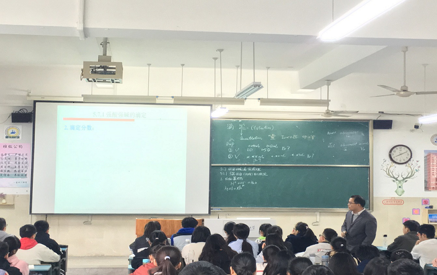 (本网讯 陆陈鑫)4月10日上午,陈红旗老师在2010308教室进行了公开课《酸碱滴定原理》,2018级应用化学专业全体学生、学院多位教师共同聆听了此次课程。