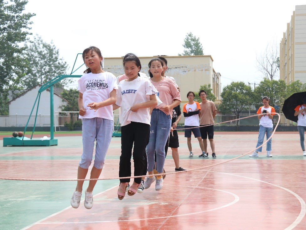 尽管正值盛夏、天气炎热,但趣味运动会仍旧如火如荼地进行着,在几位体育老师的带领下,团队成员以及学生们的热情高涨,齐心协力完成了“爱的抱抱”、“你画我猜”、“三转渡河”、“背气球”、“跳大绳”等游戏。