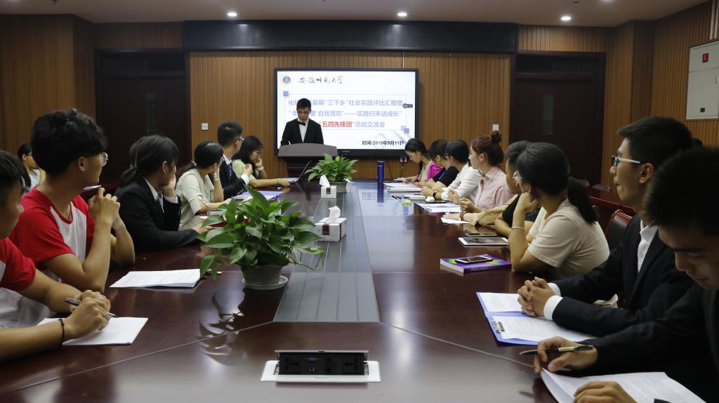 精心组织了34支实践团队奔赴江淮大地积极投身社会实践、服务基层。此次评比会中,34支团队被分为“五四先锋团”、“专业见习团”、“环保宣讲团”、“爱心服务团”分组同时进行汇报,每个团队用四分钟的时间将一群人共同奋斗的难忘历程以PPT汇报的形式娓娓道来。汇报过程中各团队主题明确、逻辑清晰。生动的照片、真实的数据、一篇篇在媒体上发表的新闻稿都是实践故事汇报者传递出的最诚挚的声音。