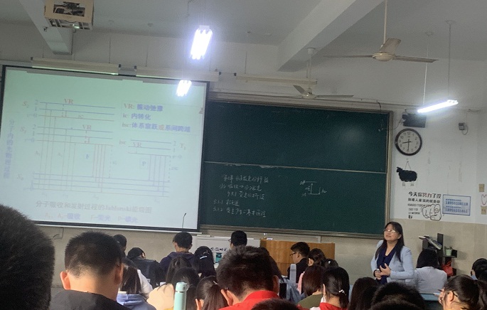 张明翠首先通过教学导读介绍了本章的学习内容,用结构图为我们呈现了光学分析法的分类。接下来,张明翠借助生活中的实例:萤火虫发光、晚会活动用的荧光棒等,引入了本节课的主要讲述内容分子发光分析法——荧光分析法。分子荧光分析法就是根据物质的分析荧光光谱进行定性,以荧光强度进行定量的一种分析方法。正所谓“知其然知其所以然”,为了让大家能够更好的掌握荧光产生的基本原理,张明翠给同学们留了几分钟时间去观察能级图,并思考相关问题。此后荆雷、张思雨两位同学积极举手发言,谈了自己的想法。张明翠也对同学的回答进行了点评,最后详细地为我们讲解了荧光产生的基本原理,使我们对这一概念有了更深刻的理解。