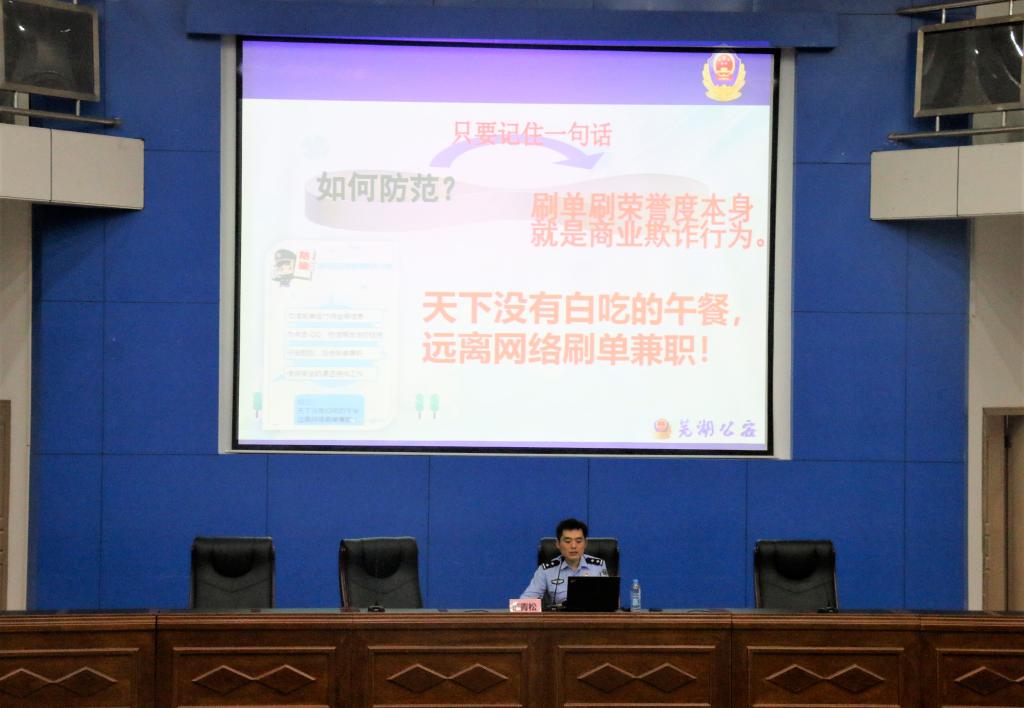 范警官以几起典型电信诈骗案例为引,分享了2019年芜湖市公安局打击电信诈骗的真实案例,介绍了最新的电信诈骗的手法,用精准的数据让大家正确认识了电信安全的重要性。为让新生进一步了解电信诈骗,范警官重点以网络刷单、校园贷两种诈骗类型进行了具体介绍,范警官指出:“诈骗现象大多都是不法分子利用受害人贪图短期利益和安全意识淡薄的心理而实施犯罪的。同学们只有做到不贪心、不妄想不劳而获,才不会沦为不法分子的诈骗对象。”同时范警官也详细介绍了如何防范电信诈骗和相应的被骗后处理办法。此外,范警官还强调,不仅要注意网络电信安全,更要不断提高现实生活中的安全意识,如宿舍生活、夜跑、日常出行等等都要以保护自身安全为首位,让同学们深刻感受到大学生增强自我保护意识,做好自我保护的重要性。