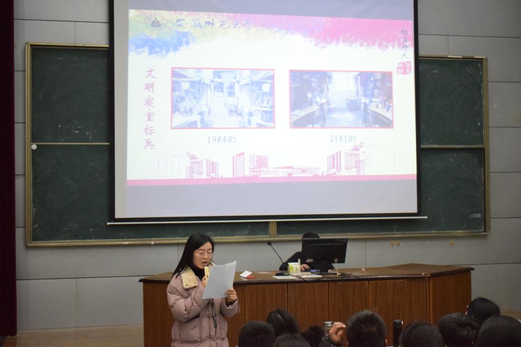 会议在各辅导员老师的总结发言中落下帷幕。19级辅导员周冬冬老师强调了自己在查寝过程中发现的一些问题,并提出了相应的意见与建议,同时表达了自己对19级新生的要求与期待:希望同学们在寝室生活中能时刻保持自律,努力营造和谐宜居的生活环境。