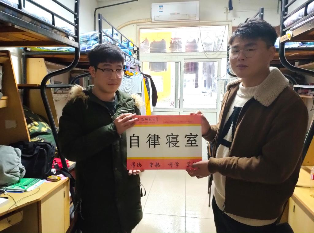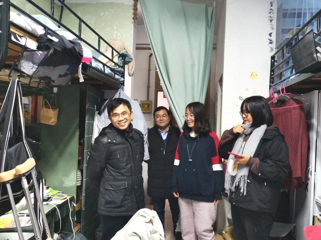 党政领导、各系主任及全体辅导员深入学生寝室,对冬季寝室安全问题进行走访排查,帮助同学们牢固树立安全意识,并分组对本年度新申请的“自律寝室”进行了挂牌。查寝过程中领导、老师发现,大部分学生寝室物品摆放有序,地面整洁干净,部分学生寝室浓郁的学习氛围更让这次查寝院领导和辅导员感到欣慰。学期末的此次检查,一是为了解高年级学生考研结束后的学生生活学习状态,二是了提醒督促同学们注意冬季用电安全。走访过程中,领导、老师们与同学们进行了亲切交流,关心同学们的生活状况,叮嘱同学们注意用电安全、财产安全。