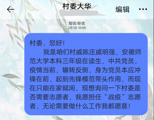 2017级化学非师范专业的戚明强同学是一名预备党员,疫情面前,他时常思考大学生党员如何不忘初心,冲锋在前?一面是安安稳稳在家过寒假,一面是冒着严寒参与一线疫情防控工作,每天看着朋友圈里、微博中那些勇敢而坚毅的青年们,为了人民的生命健康奋站在一线,他心潮澎湃,心生向往,思考着“他们行,我为什么不行呢?”这天,他告诉父母,自己要去当一名志愿者,要成为一名防疫志愿者。父母虽有顾虑但仍旧给了他极大的支持和鼓励。而后他通过短信的形式给当地村委会发出请战书,志愿成为防疫志愿者,成为一名奋战在一线的大学生党员。
