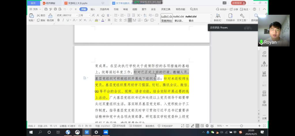 本网讯(应化系党支部 陶勇/胡倩倩为增强疫情期间党员教育管理,确保支部组织活动正常进行,4月25日20:00,应化系本科生党支部召开线上支部大会暨主题党日活动,支部全体党员参加会议,此次会议由支部书记陶勇老师主持。