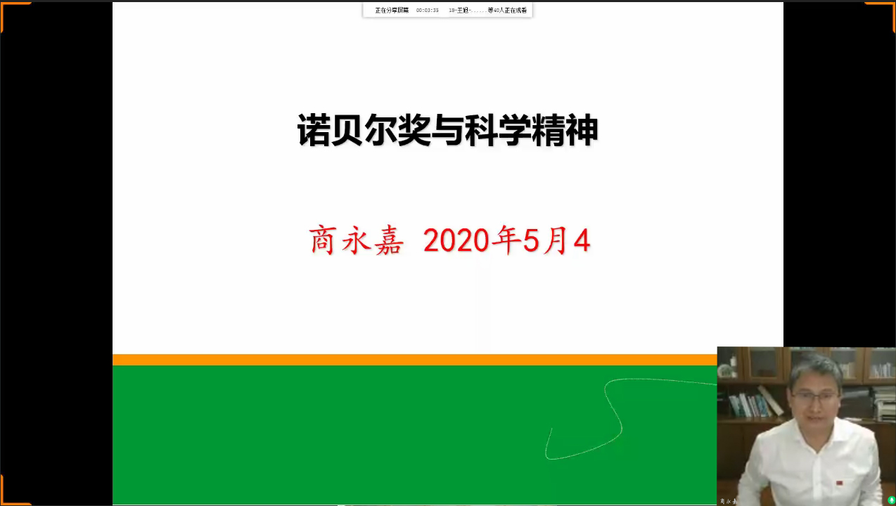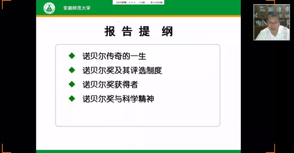5月4日晚19:30,商永嘉教授佩戴国旗徽章准时与同学们相约线上。活动伊始,商永嘉教授以习近平总书记对青年的寄语——“青春由磨砺而出彩,人生因奋斗而升华”,表达了对青年学子美好的祝愿与期盼。商永嘉教授围绕讲座主题,从科学家诺贝尔传奇的一生、诺贝尔奖的构成与评选、奖项获得者以及其科研成果和诺贝尔奖背后的精神展开讲述。首先,商永嘉教授以故事的形式向同学们讲述了诺贝尔艰难的成才之路,勉励同学们学习诺贝尔对待生活不屈不挠的意志品质、对待科研勇于探索的精神。随后,商永嘉教授详细介绍了的诺贝尔奖的奖项设置、奖金情况、奖章证书、颁奖仪式、相关机构及评选流程,分享了屠呦呦、杨振宁等华人科学家获奖背后的辛酸故事以及爱因斯坦、野依良治等各领域代表人物的科研成果。