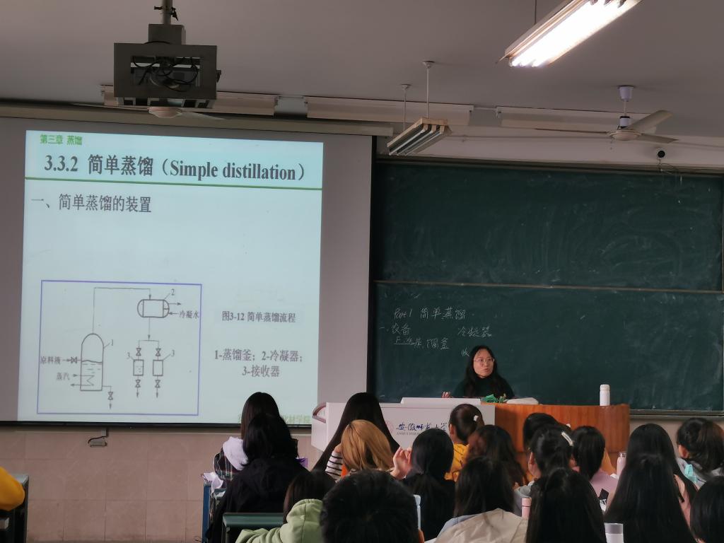 王露老师在上课一开始,带同学们复习了上节课平衡蒸馏的内容,层层递进引出了简单蒸馏的内容。重点讲授了简单蒸馏的装置,原理和计算,同时邀请同学回答幻灯片上的习题,融入课堂的思考氛围。王露老师通过动态的多媒体课件结合详细的课堂讲解,内容充实清晰,重点难点突出,语言风趣幽默,使原本枯燥的理论知识变得生动形象,让学生们记忆深刻,同学们表示获益匪浅。