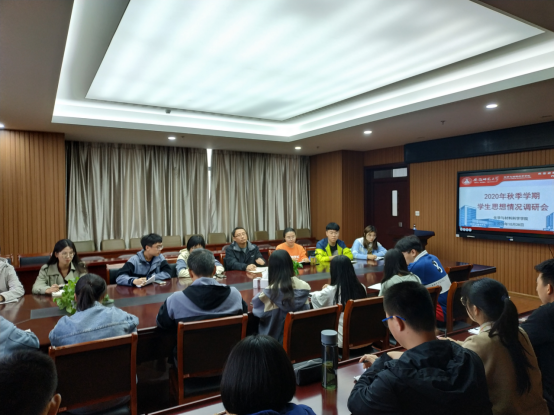于10月28日下午召开2020年秋季学期学生思想情况调研会,学院党委书记汪俊武,院长高峰,党委副书记余妍霞,辅导员以及学院各年级各专业学生代表参加此次会议。