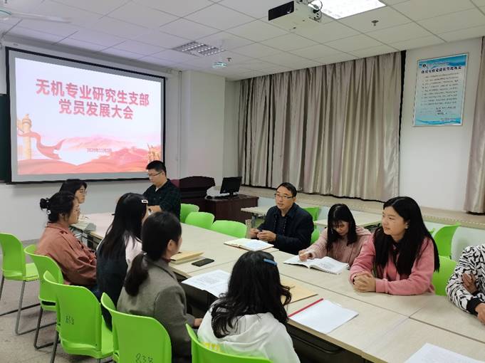 本网讯(无机专业研究生党支部 杨琨)11月2日傍晚,无机专业研究生党支部召开了党员发展大会及十九届五中全会精神学习会。学院党委书记汪俊武出席并做指导讲话,全体支部党员及发展对象参加会议,会议由支部书记杨琨主持。