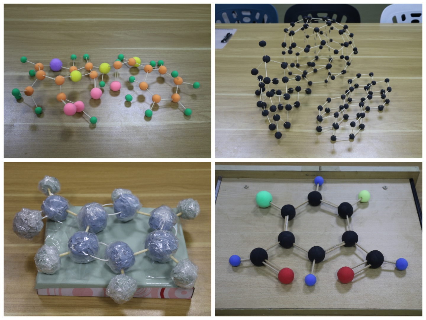 赛前,各组参赛选手认真制作了分子模型的说明书,从分子性质、用途等方面初步介绍了自己制作的分子模型,在比赛现场,各组汇报人从分子模型设计思路、制作材料等方面进行了详细的介绍。面对各位评委对作品创作理念与心得的询问,并结合参赛作品的手工技巧、创新性、科学性等方面做出评分。活动最后,曹右林老师与郑丽老师对分子模型的环保性与实用性给予了高度评价,并对大家寄予厚望。
