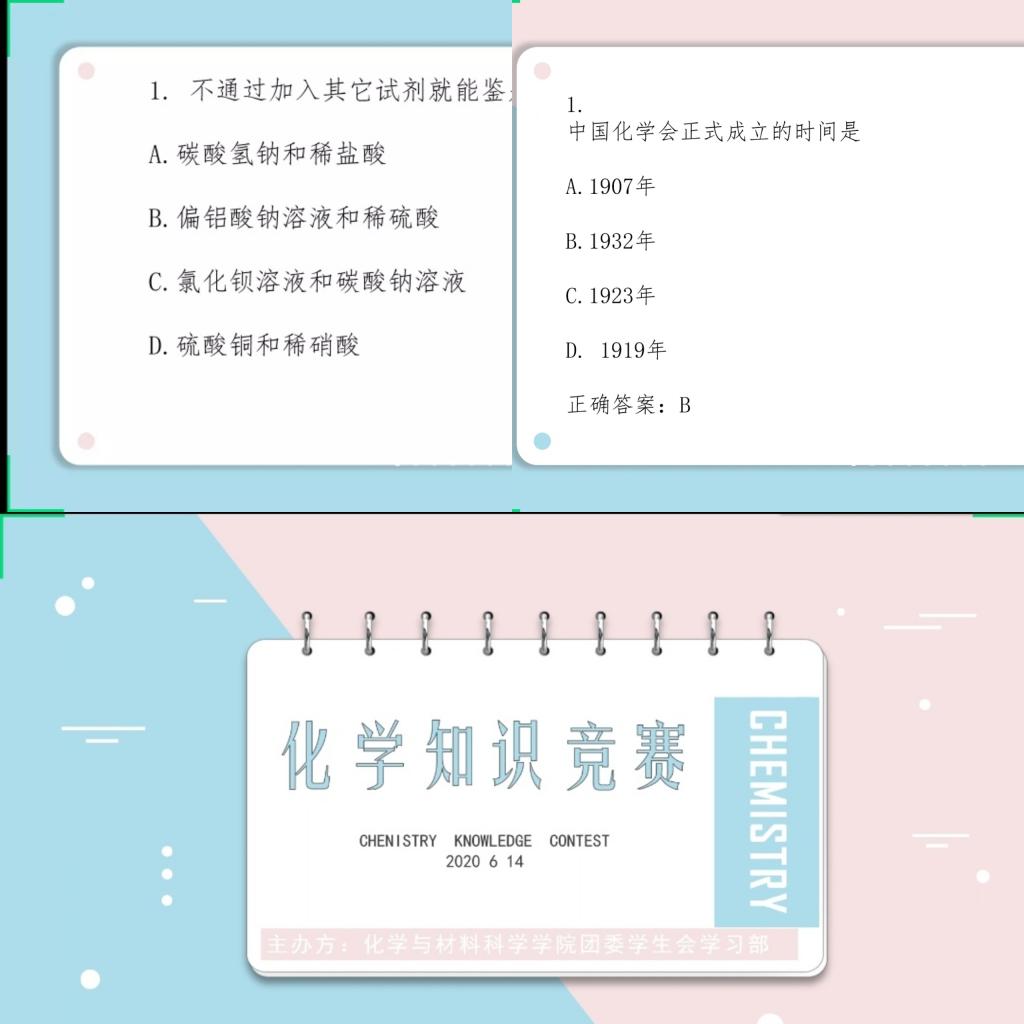 针对网课的开展情况,特举办学生课堂笔记大赛,以巩固所学知识,提高线上教学的效率。同时学院结合各专业特色,根据不同年级的需求,针对17级开展化学文献检索大赛、18级开展化学专业知识竞赛、19级开展“科普化材”化学科普知识竞赛。在各项活动中,参赛选手根据所学专业知识,进行精彩的演讲汇报和答辩,充分展现了专业技能。
