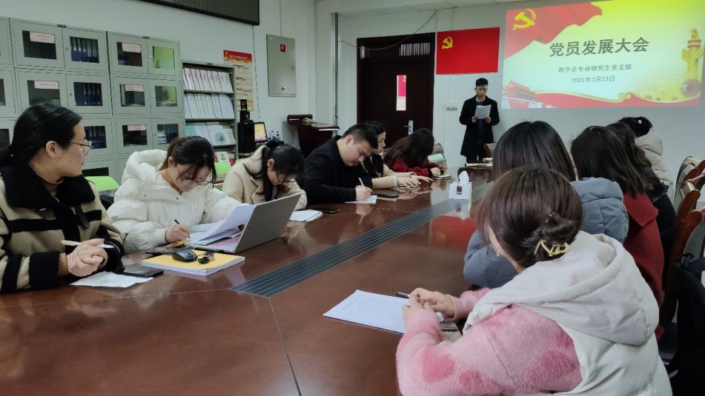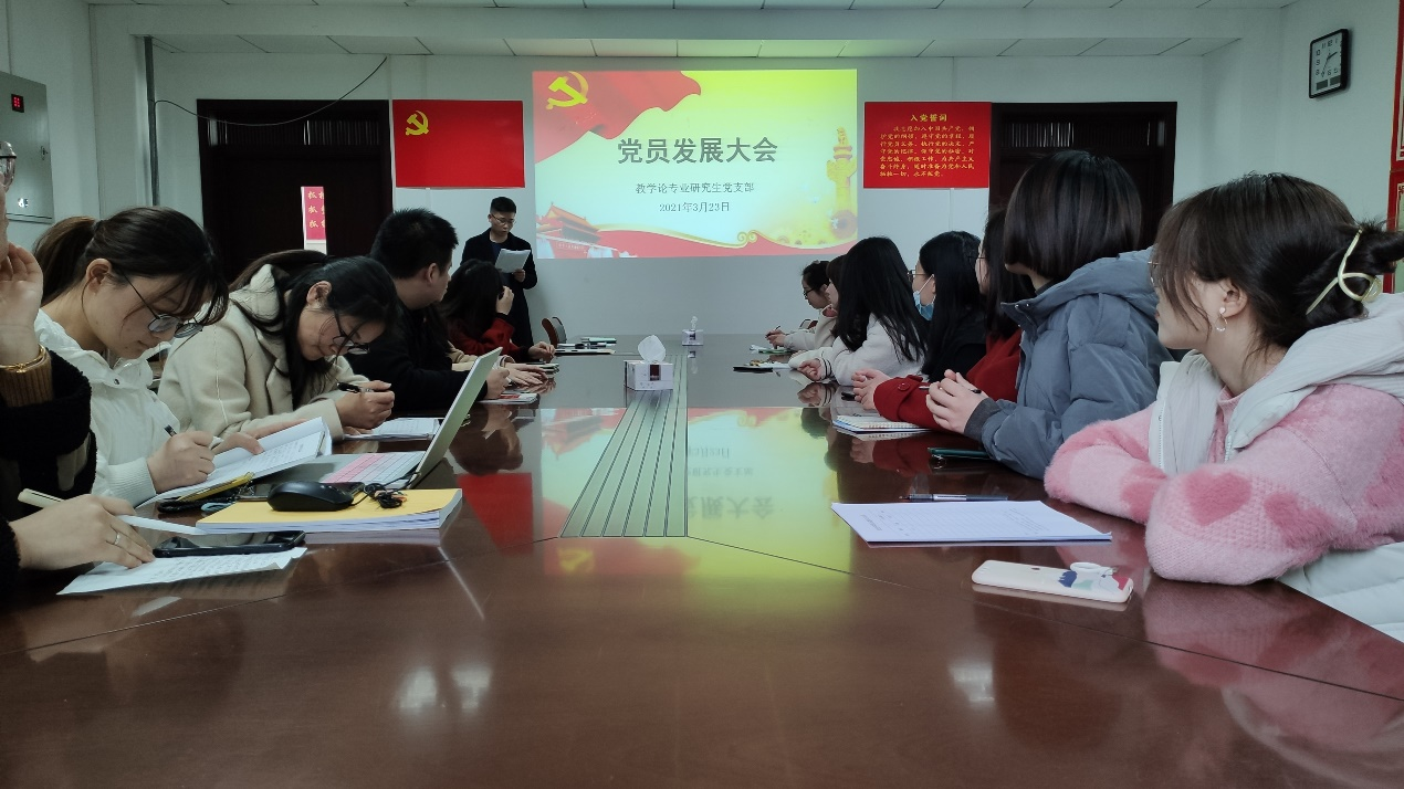 为积极响应党的号召,培养优秀党员,教学论专业研究生党支部于3月23日下午2:30在礼勤楼707党员活动室召开本年度第一批党员发展大会,支部全体党员、预备党员及发展对象参加会议,会议由支部书记王磊主持。