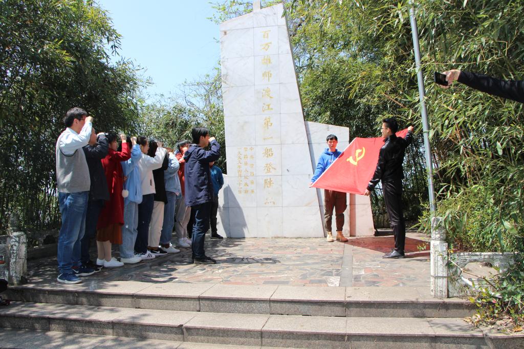 板子矶(又名鹊起矶)位于芜湖市繁昌县荻港镇长江边,有“吴楚关锁”之称,是“长江二十四矶”之首。因其地势险要,历来是兵家必争之地。解放战争期间,百万雄师横渡长江的渡江战役中,这里是渡江第一船的登陆地。在渡江战役第一船登陆点纪念馆,全体成员聆听讲解员的介绍,了解先辈们渡江的英勇事迹,瞻仰渡江战役遗留的文物。先辈们舍身战斗的场景仿佛就在眼前,让人感动不已,心生敬畏。大家一同观看了历史电影,感叹当今美好生活来之不易,激发奋发图强的精神斗志。最后,全体党员瞻仰了渡江战役第一船登陆点纪念碑,面对着鲜红的党旗再一次重温了庄严的入党誓词。