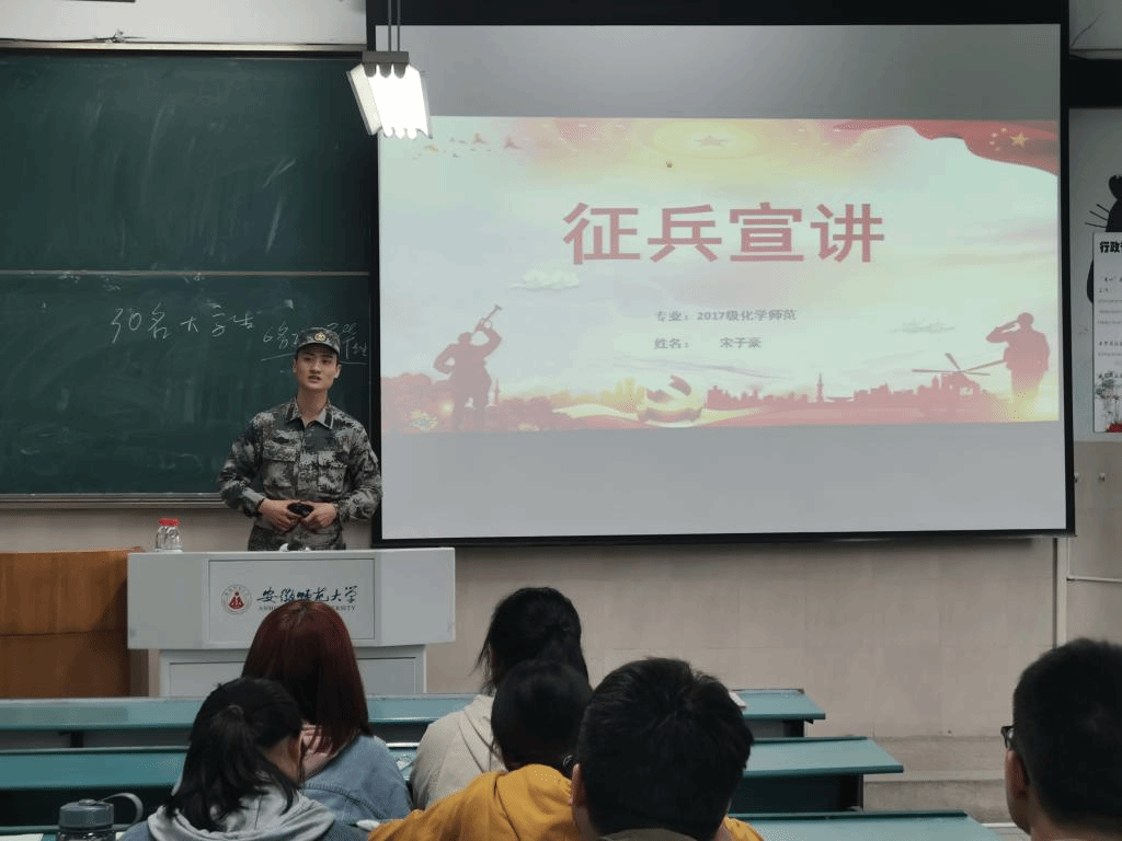 蒋建伟分别从参入伍政策、经济和精神这三个方面对毕业生应征入伍进行详细阐述,认真介绍国家和地方对于毕业生应征入伍的福利优待及参军对于毕业生个人的发展所发挥的重要作用,鼓励符合条件的毕业生积极参与征兵计划。已退役的宋子豪同学,身着一袭迷彩军装,结合自己的军旅成才之路,满怀热血地向参会的同学介绍自己的军旅生活及征兵政策,并对有意向入伍的同学留下来自“老兵”的寄语。一身戎装致青春,满腔热血卫山河,青春年华奉献祖国,既是使命,亦是荣耀!
