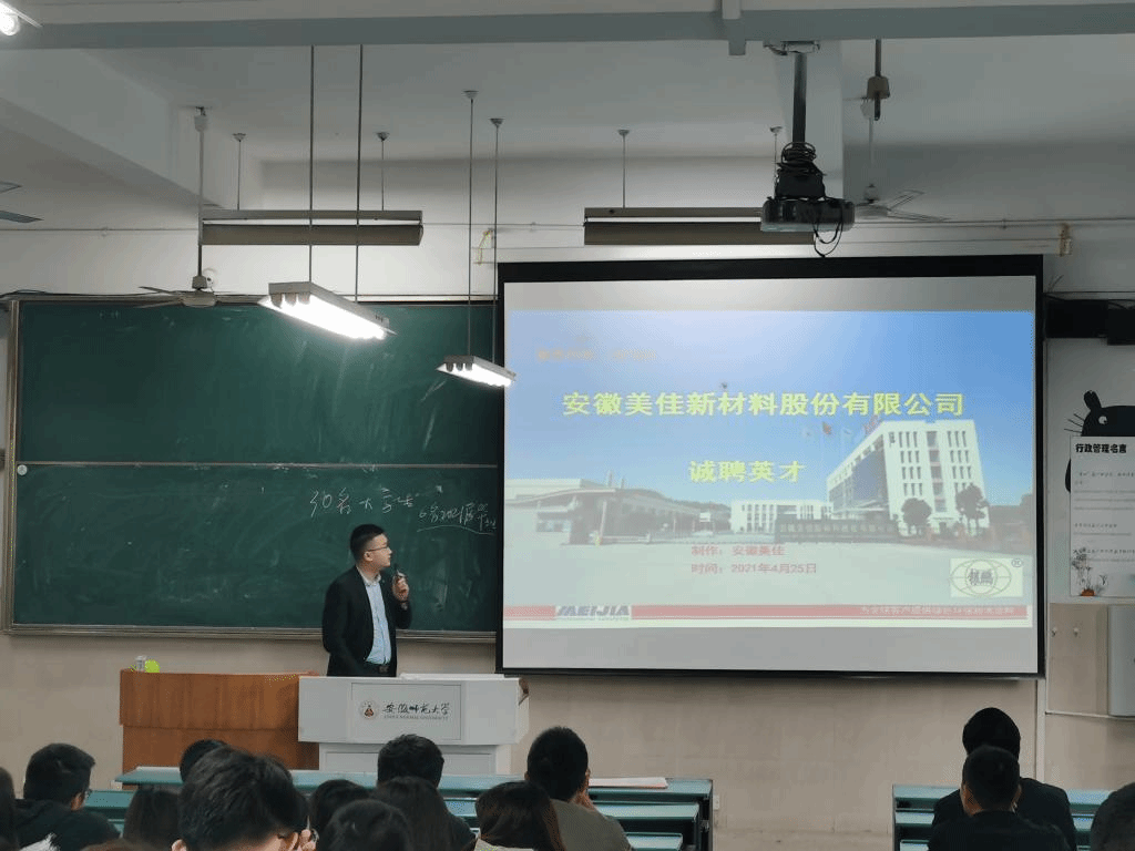 安徽美佳新材料股份有限公司、安徽艾密克电联科技有限责任公司、安徽圣奥化学科技有限公司、安徽神剑新材料股份有限公司、安徽东华通源生态科技有限公司五家公司分别从公司的发展现状、战略目标、产品应用行业、色情视频环境、招聘岗位要求与福利待遇等方面向作毕业生具体介绍。参会同学们都仔细聆听,并积极参与提问。