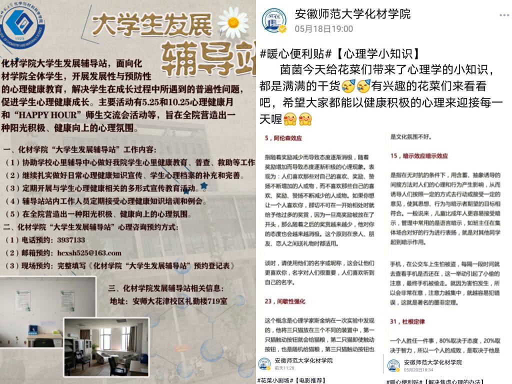 高度重视学生的成长规划和心灵对话的教育和引导,发挥大学生发展辅导站的功能,继续扎实做好各项工作,利用学校、学院、班级、宿舍四级联动机制,以实际行动落实学院心理健康教育工作,在全院营造靠近彼此,温暖彼此的温馨氛围。