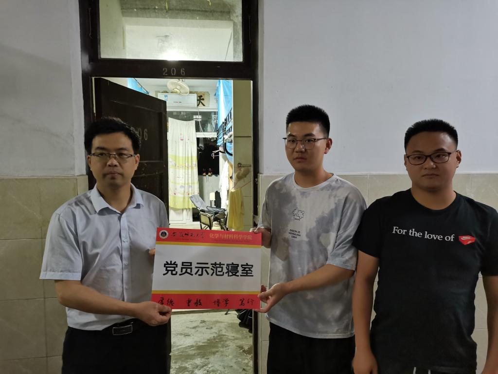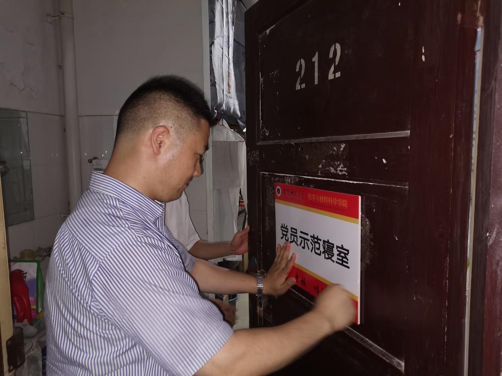 领导老师们深入学生宿舍,为党员寝室挂牌、亮身份,在挂牌过程中强调,党员要在和谐宿舍创建工作中充分发挥先锋模范作用,以实际行动影响和带动其他学生养成良好的行为规范,努力营造干净舒适的学习生活氛围,促进学风建设和学生健康成长。学生党员们也立志严格要求自己,遵守各项规章制度,加强室风建设,彰显化材学子青春风采。