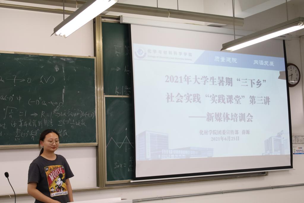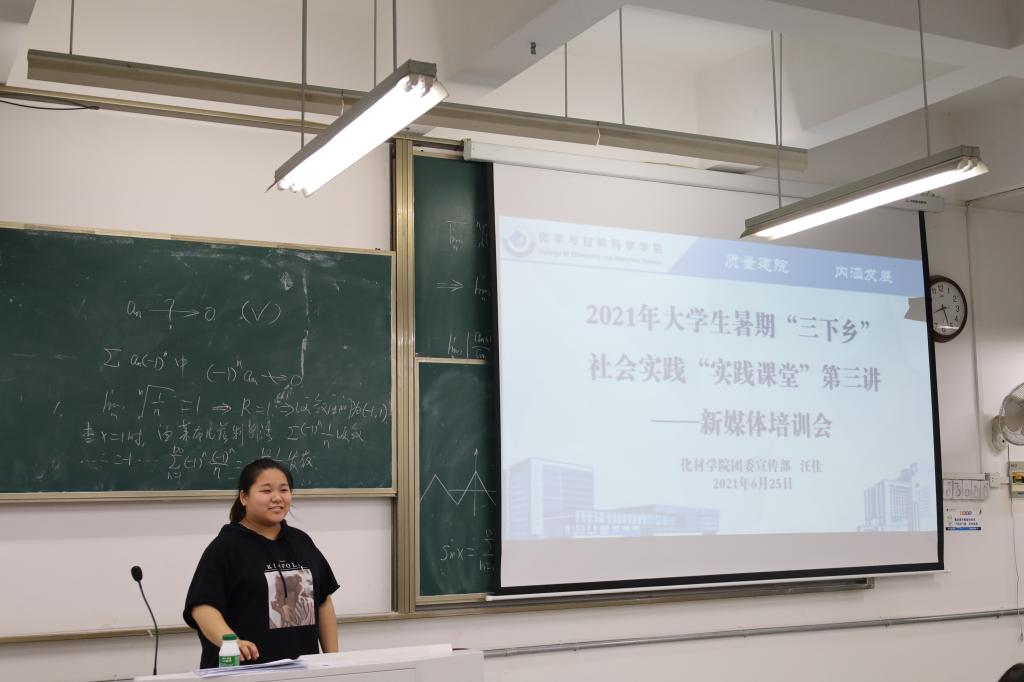 陶勇老师首先介绍了开展暑期社会实践活动的意义,结合往年宣传经验、通讯稿投稿量和新媒体平台运营情况,强调了宣传工作在暑期社会实践活动中的重要性。随后,学院学生会主席、2020年暑期社会实践优秀个人郭晶晶同各队宣传员分享了通讯稿的投稿经验,并介绍了投稿所需的注意事项。团委宣传部部长吴泓婧则从新闻稿的撰写入手,将通讯稿的文字撰写、图片拍摄和格式要求进行了说明。团委宣传委员汪佳和团委宣传部副部长薛源介绍了QQ、微信两大新媒体平台的运营方法,并详细介绍了说说图文动态、微信公众号推文的制作方法。与此同时,此次培训会也向各队宣传员公布了校级重点团队、院级重点团队和班级团队的宣传指标,并布置了实践过程中宣传日报的具体工作时段和工作要求。