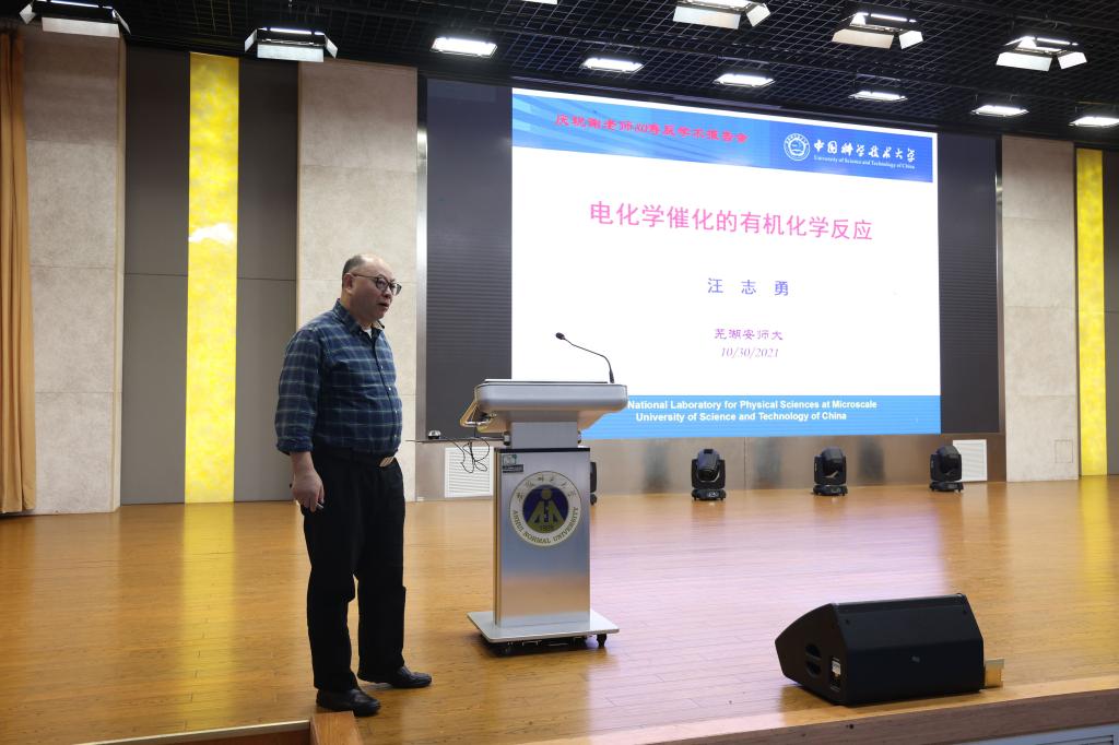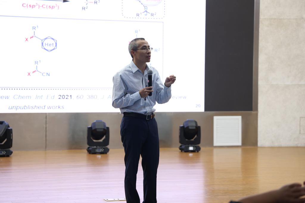 专家学术报告会由“功能分子固体”教育部重点实验室副主任郝二红主持。汪志勇教授作了题为《电化学催化的有机反应》的报告,介绍了课题组在该领域的代表性工作成果;刘心元教师分享了《手性阴离子-铜催化不对称交叉偶联反应》的报告,介绍了课题组在该领域的系列工作;徐利文教授作题为《Precise Evolution of Multifunctional Chiral P-ligands for the Enantioselective Construction of Carbon/Silicon-stereogenic Centers》的报告,并深情朗诵了一首自己创作的贺词:谢天谢地师常在,筱仙筱鹤一起拜。娟然如拭享天伦,寿比南山福如海。