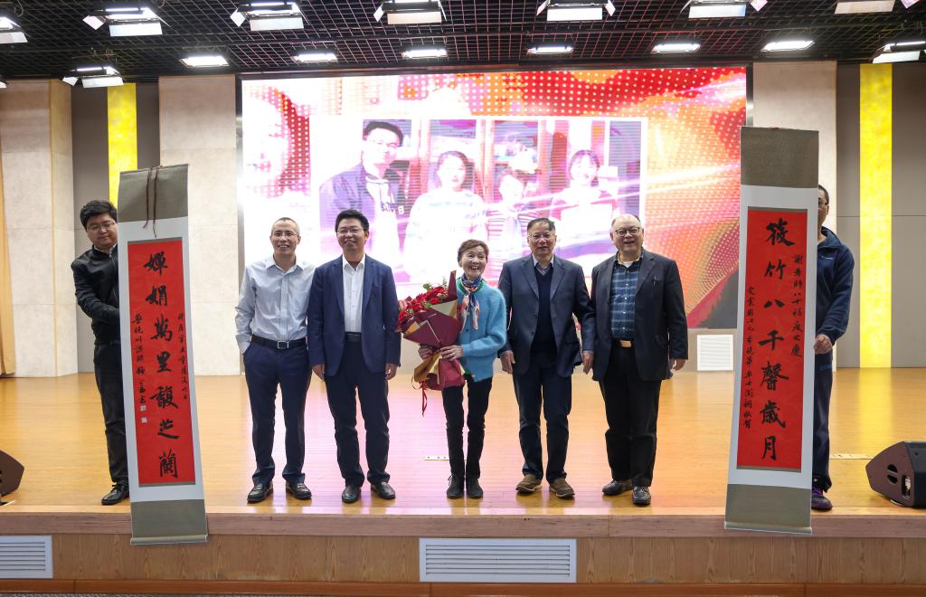校友代表赵刚在致辞中表达了对恩师多年来培养的感谢之情,深情回忆了谢老师对学生给予的悉心指导和无私帮助。在谢老师耐心、严谨的培养下,打下扎实的理论知识和严谨的实验操作功底,为之后的研究奠定了基础,受益终生。紧接着,4位校友共同向谢筱娟老师致敬献花。刘心元校友送上自己所作对联“筱竹八千馨岁月,婵娟万里馥芝兰”。