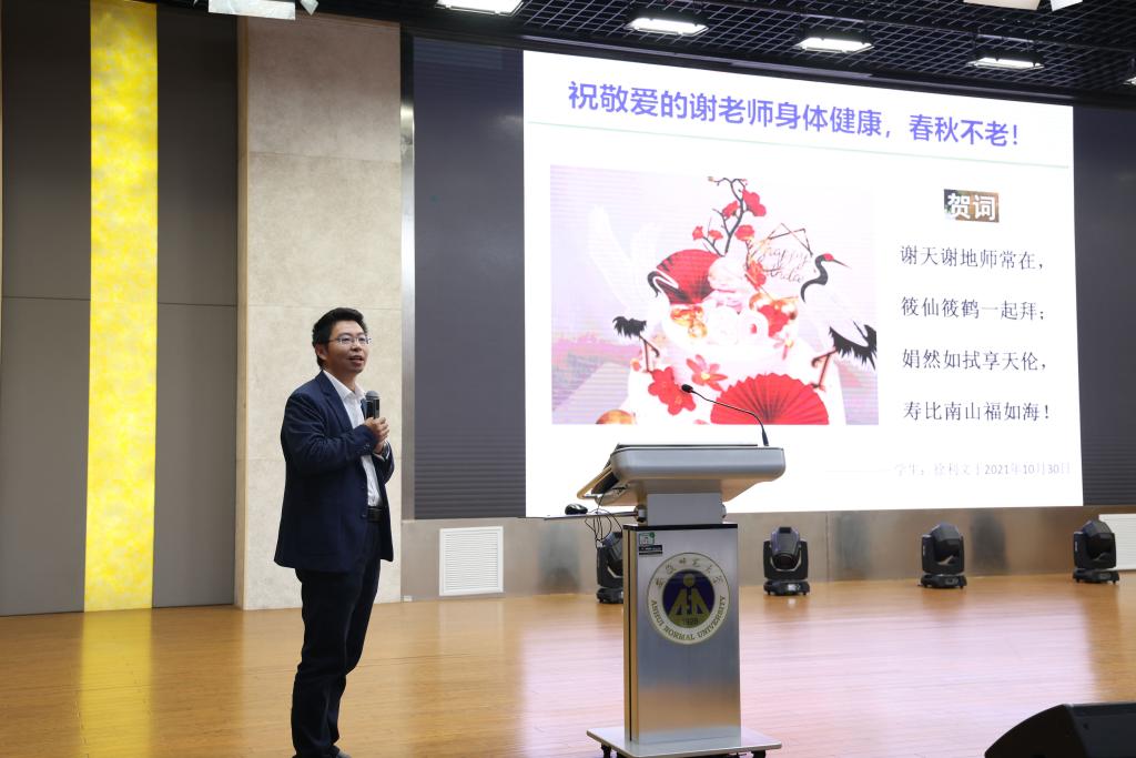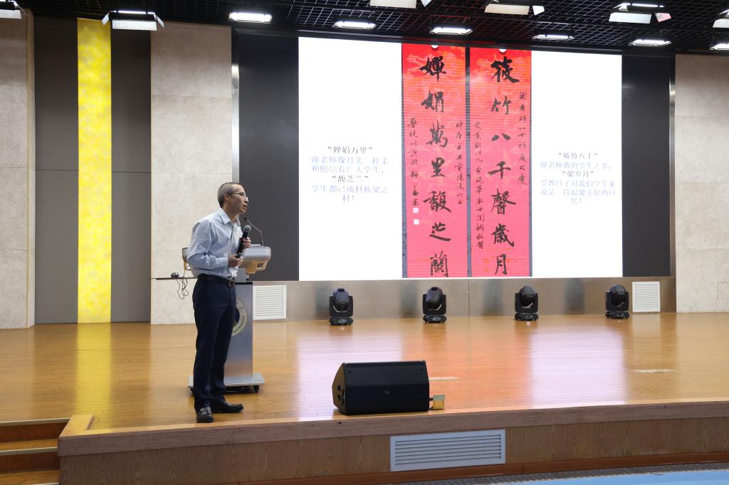 熊宇杰在致辞中向谢筱娟老师表示美好的祝福,对各位校友和嘉宾的到来表示诚挚的欢迎,感谢各位校友长期以来对学校事业发展特别是化学学科建设的关心支持。他指出,谢筱娟老师是我们非常敬重的一位老教师,她始终把教书育人作为自己的毕生追求,用真心真情践行立德树人的职责使命。我们要学习谢老师坚守初心使命、潜心教书育人的精神。同时,学校举办专题学术报告会,开展有机化学前沿论坛,对于推进“功能分子固体”教育部重点实验室和化学学科建设发展,培养造就更多更优秀的化学专业人才具有重要作用。