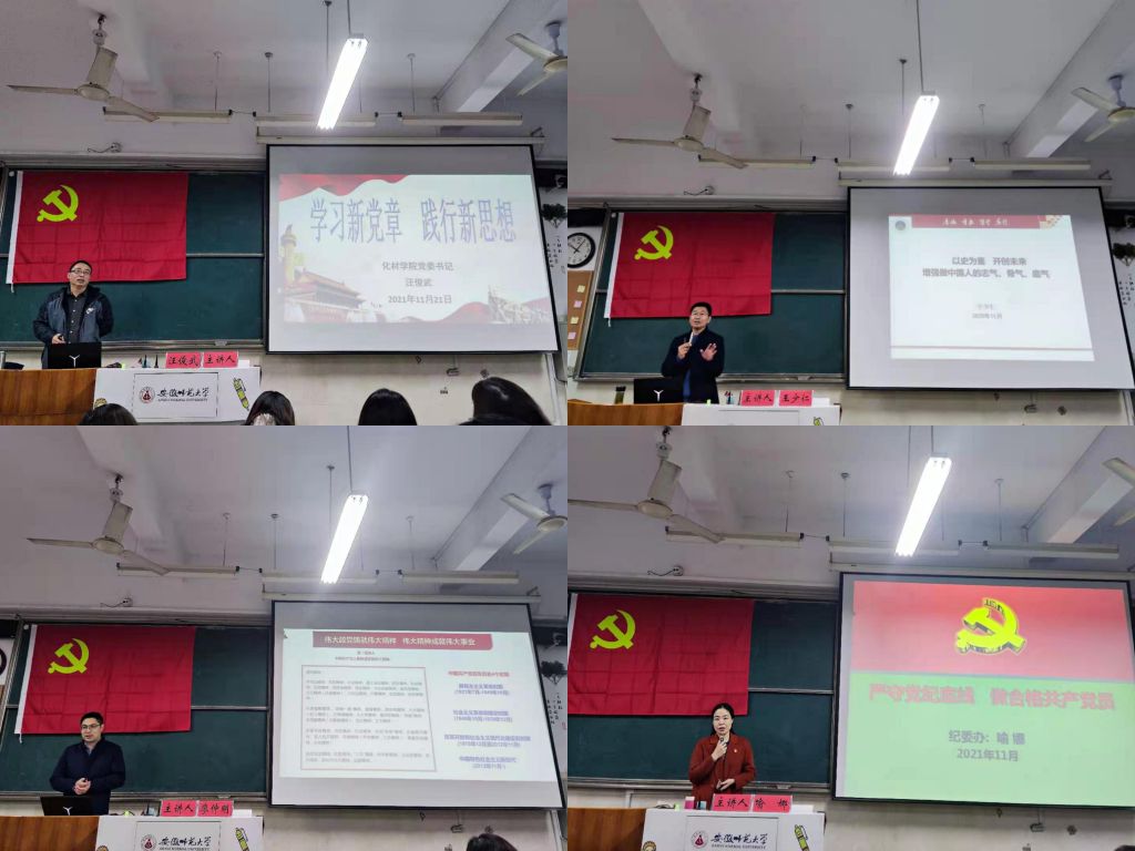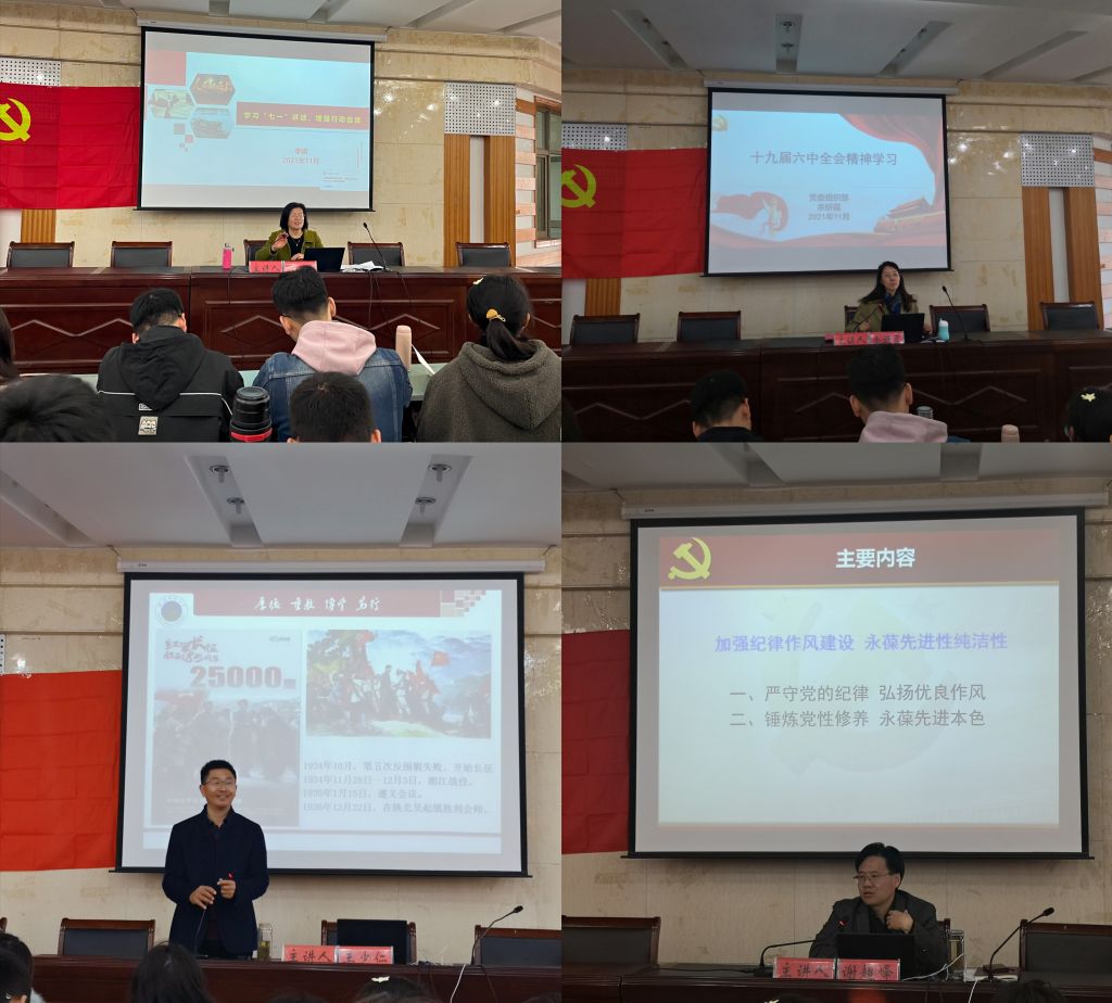 发展对象培训班邀请物电学院党委书记李娟,学校党校常务副校长、组织部副部长谢超峰,组织部副部长余妍霞,宣传部副部长王少仁等领导老师重点解读习近平总书记“七一”重要讲话精神、党的十九届六中全会精神、党章党规教育、党的纪律等专题。李娟从深刻认识全面建成小康社会伟大成就和历史意义、伟大建党精神的理论创新意义、以史为鉴、开创未来的根本要求、深入领会党的奋斗光辉历程和“一个主题”、马克思主义立场的观点方法、伟大号召蕴含的历史意义六个方面,详尽剖析并加深了学员对党百年奋斗历史意义的理解。谢超峰以“加强纪律作风建设,永葆先进性和纯洁性”为主题,从严守党的纪律,弘扬优良作风、锤炼党性修养,永葆先进本色两个方面说明遵守党的纪律的重要性,让大家深层次感受党的庄严;余妍霞从三个重要历史《决议》和四个历史时期的时间维度向大家讲述党的百年奋斗重大成就和历史经验。王少仁从历史的角度,用故事的描述方法,从鸦片战争讲起,勾绘出中国共产党百年奋斗的恢弘史诗,以史为鉴、开创未来,增加了发展对象做中国人的志气、骨气、底气。
