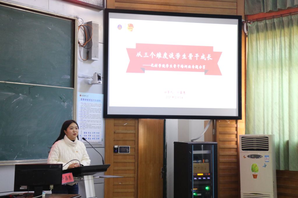学校团委学生副书记、文学院2019级汉语言文学专业硕士研究生宁嘉惠为全体学员作了题为《从三个维度谈学生骨干成长》的专题报告。她从自身本科阶段学习谈起,结合参加研究生支教团的经验,分析学生工作的要领以及益处。同时,她也分享了因本科阶段的学生工作基础,对自身学习工作的受益之大,教导全体学员如何以合理的方式扎实做好各项学生工作。在工作实务方面,宁嘉惠还详细介绍了会场布置和礼仪方面的技巧,并与现场学生积极互动,现场氛围活跃,在轻松愉悦的交流中,结束了本次分享。