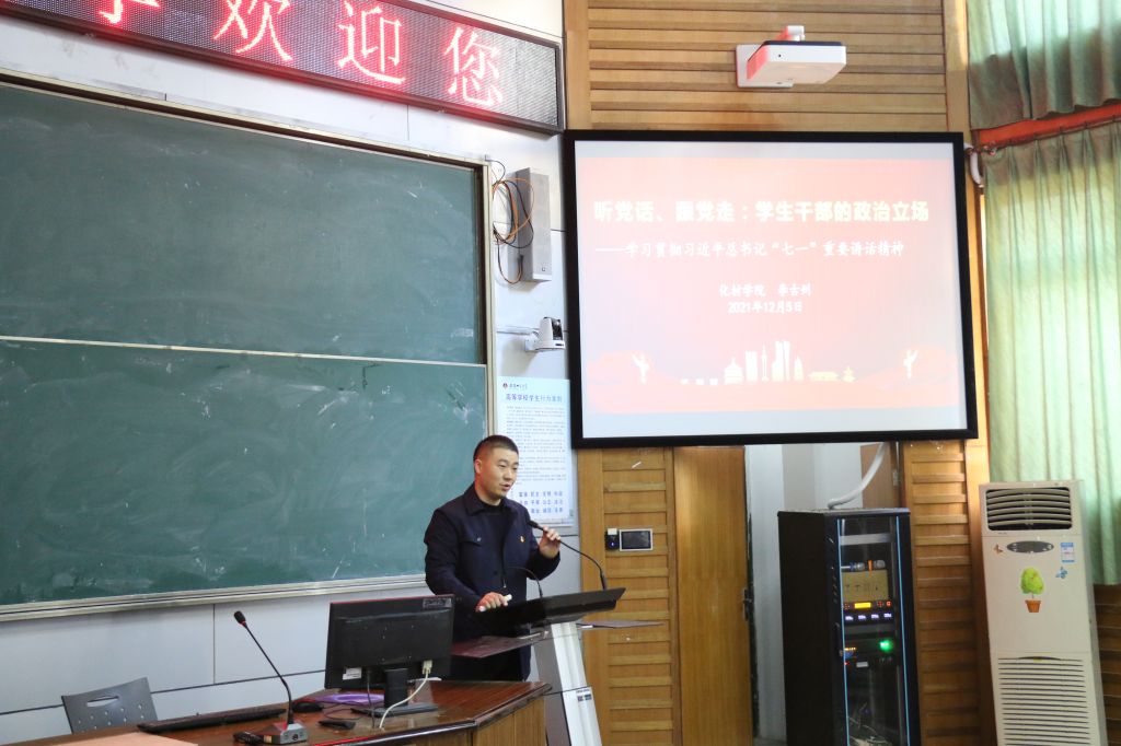 院党委副书记李古州为培训班学员作题为《听党话、跟党走:学生干部的政治立场——学习贯彻习近平总书记“七一”重要讲话精神》专题报告,他以习近平总书记“七一”重要讲话精神为切入点,围绕“七一”重要讲话的背景意义和深远影响、丰富内涵、新思想新观点新论断、青年肩负起实现伟大复兴的历史使命四个方面进行展开。他指出新时代的学生干部应当充分发挥桥梁与纽带、带头与表率、服务与管理的作用,在工作中强化责任意识、服务意识、集体意识、创新意识等“四种意识”,提升脚力、眼力、脑力、笔力等“四种能力”,熟练掌握用科学理论武装、理想信念引领、高尚品德浸润、生动现实教育青年学生等“四种方法”,保持耐心、细心、责任心,做到政治觉悟高、工作标准高、工作效率高。最后,他号召全体学员要积极践行“请党放心,强国有我”的青春誓言,续写无愧于党、无愧于时代、无愧于青年的事业发展新篇章。