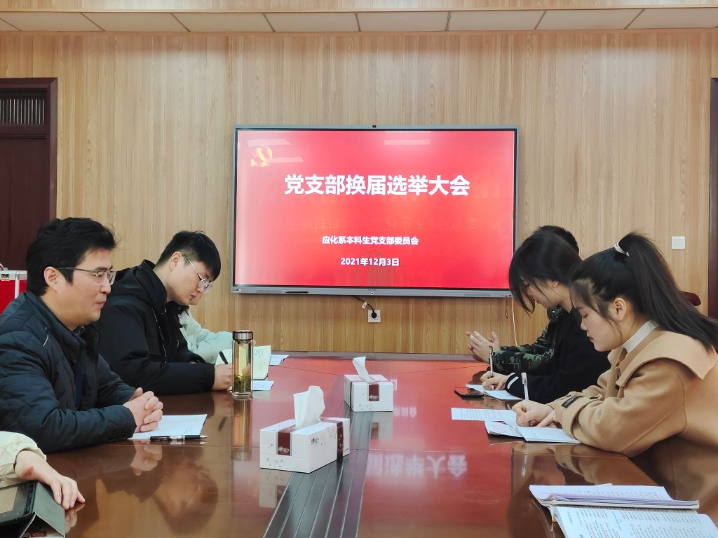 本网讯(应化系本科生党支部 曹玉昆)12月3日下午,应化系本科生党支部在礼勤楼707室召开了党支部换届选举大会。本次大会由支部书记陶勇主持,应化系本科生党员全体参加此次会议,院党委委员、院长高峰应邀列席会议指导。