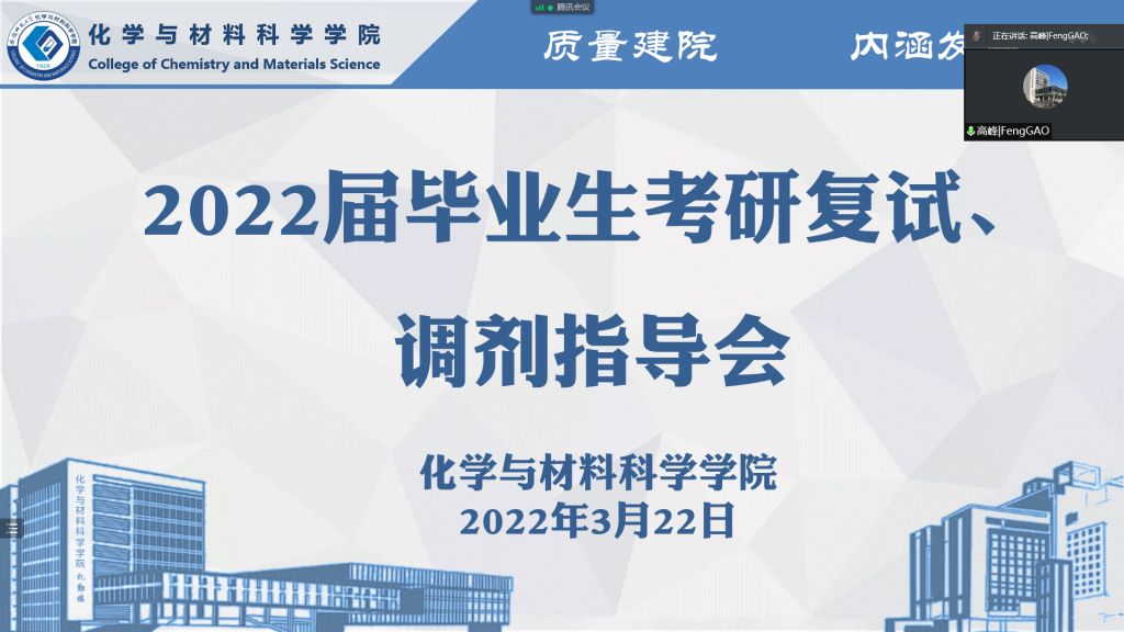 3月23日晚,为切实做好2018级学生考研复试与调剂的指导服务工作,学院利用腾讯会议在线上举行了2018级考研复试与调剂指导会,院长高峰、副院长周双六、校研究生招生办主任凌从祥、毕业班辅导员程紫丹、陶勇以及2018级考研通过国家线的学生参加本次会议,会议由院党委副书记李古州主持。