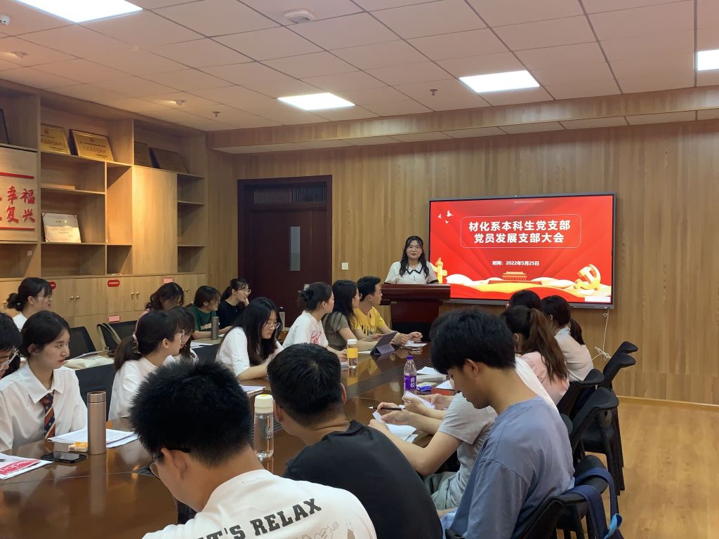 材化系本科生党支部在礼勤楼707会议室举行了2022上半年第二批党员接收党支部大会。本次大会由党支部书记王芳老师主持。材化系本科生党支部现有党员44人,实到会42人,因事请假2人,现有表决权的正式党员12人,实到会正式党员11人,本次实到会有表决权的正式党员人数符合组织规定。