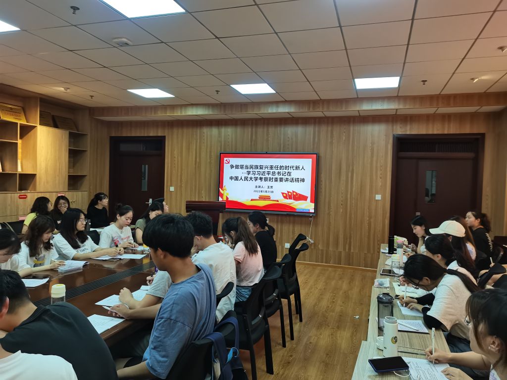 党员发展大会之后,王芳老师带领同学们开展了习近平总书记在中国人民大学讲话精神学习分享交流会,会上,王芳老师首先对2022年4月25日上午习近平总书记到中国人民大学考察调研、及发表的重要讲话精神做了具体概括。从学习动机出发,王芳老师分别从立足全局即“中华民族伟大复兴的战略全局、世界百年未有之大变局”的角度,和教育是国之大计、党之大计的角度向我们阐述了本次学习的意义所在。随后,王芳老师从高校立身之本在于立德树人为出发点,向我们分析解读了讲话中习近平总书记对高校思政课育人育才的殷切期待,注重强调了高校在“五路大军”中所发挥的哲学、社会科学等社会效应。