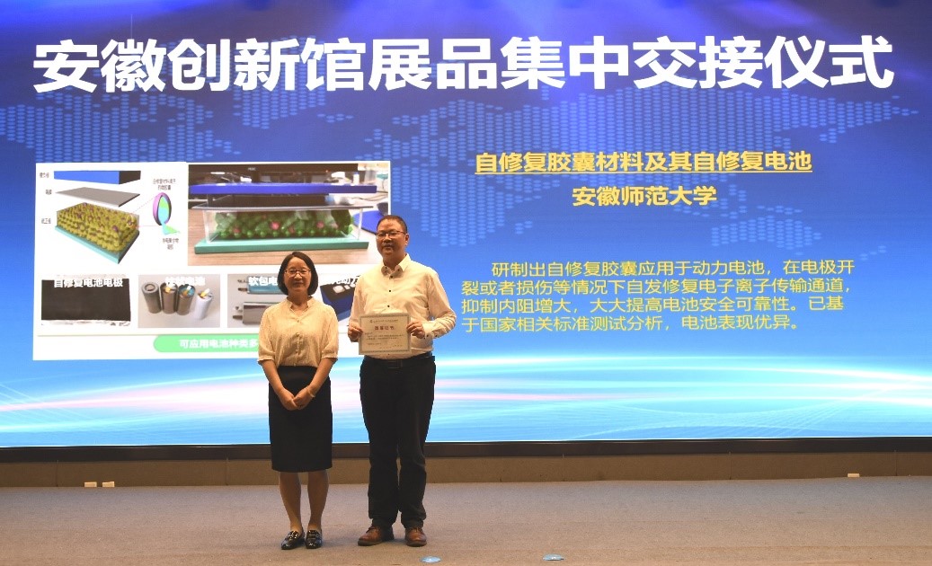 “自修复胶囊材料及其自修复电池”将自修复胶囊应用于动力电池,可以大大提高动力电池的安全可靠性和长期循环稳定性。经过国家相关标准的测试分析,运用了自修复微胶囊技术的动力电池各项指标均表现优异。展品集中交接仪式后,刘金云教授接受了合肥新闻频道的专访(视频链接://mp.weixin.qq.com/s/hynquvrTyWWENIrwAY07Fw),在采访中表示“自修复胶囊材料可以在一些苛刻使用条件下智能地、自发地修补电子传输的通道,形成新的‘桥梁’,保障新能源汽车动力电池的电学性能稳定”。相关研究得到了安徽省科技重大专项项目的支持。研究成果在安徽创新馆的展示,将促进公众对创新成果的了解,也有助于进一步加强社会对科研创新的关注和热爱。