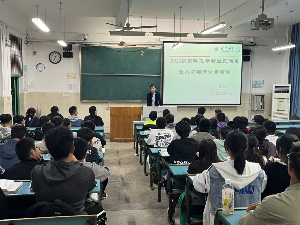 黄玉成老师重点向同学们介绍了材化系系情、2022版人才培养方案具体内容以及材料化学专业的配套实验室、教学科研平台和设备以及学校目前发展的大背景,让同学们从师资情况、教学成果、科研产出等方面深入了解学院材料化学专业的具体情况。