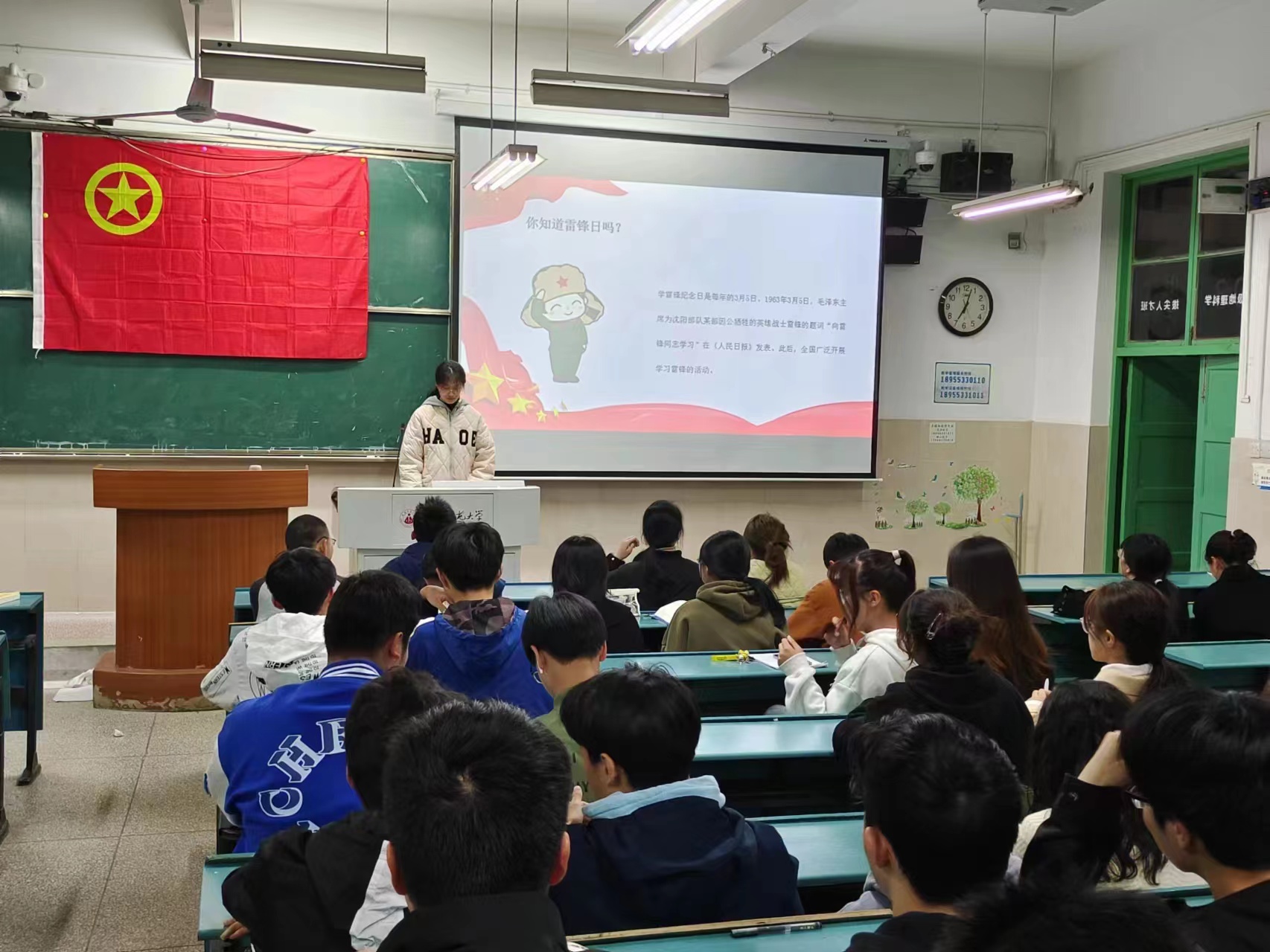 关工委副主任宫世国老师给同学们带来“新时代大学生如何学习雷锋精神—纪念毛泽东等老一辈革命家为雷锋同志题词60周年”为主题的讲座,由雷锋同志的生平事迹到雷锋精神的内涵,带领在场学生对弘扬雷锋精神的行动进行了具体的梳理。他指出,雷锋精神的主题内容和内涵需要联系到新时代的现实,新的时代主题和使命对新时代青年提出了新的要求,也为雷锋精神注入了新的内涵,大学生志愿服务就是为人民服务,勉励同学们要毅然投入到行动中去。随后,2022年校十佳志愿者、研支团成员吴泓婧作了“用奉献点亮青春灯塔,用行动彰显青年风采”的主题汇报,吴泓婧结合自身丰富志愿服务活动经验,从科普宣讲到疫情防控再到西部支教,向在场的学生详细讲述了雷锋精神的赓续与传承。吴泓婧说道:“时代在变,志愿服务的方式方法也在变化,但我相信雷锋精神的底色从未改变,越来越多的青年人主动参与到志愿服务当中,将青春融入党和人民事业当中。今年7月,我将奔赴到祖国的西部地区开展为期一年的支教活动,我将用自身所学帮助孩子们学习成长,有一份光,发一份热,用实际行动践行雷锋精神。”